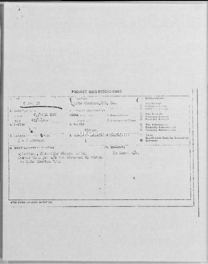 Project 10073 Record Card — Lake Charles, La., 9 August 1952
