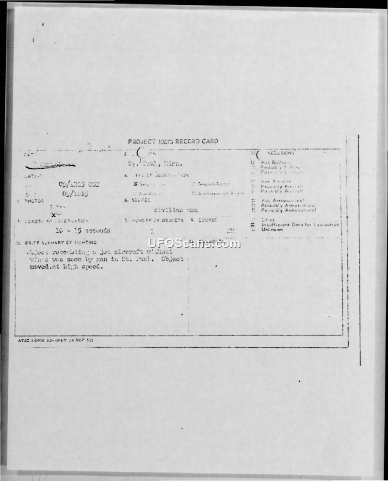 A 43-year-old engineer in St. Paul, Minnesota, reported a 10-15 second sighting of a noiseless, wingless, elliptical silver object on August 9, 1952. The report was processed by the 31st Air Division and forwarded to the Air Technical Intelligence Center for evaluation.