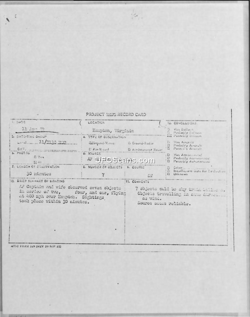 Project 10073 Record Card and Air Intelligence Information Report — Hampton, Virginia, 11 August 1952