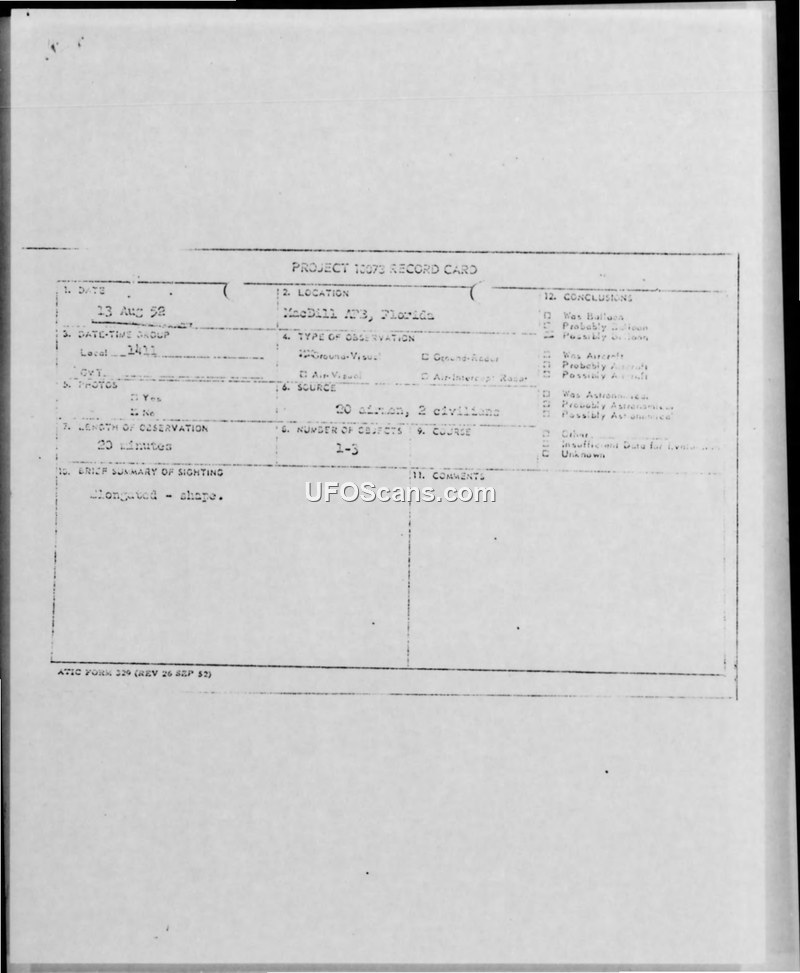 Project 10073 Record Card and Air Intelligence Information Report — MacDill Air Force Base, 13 August 1952
