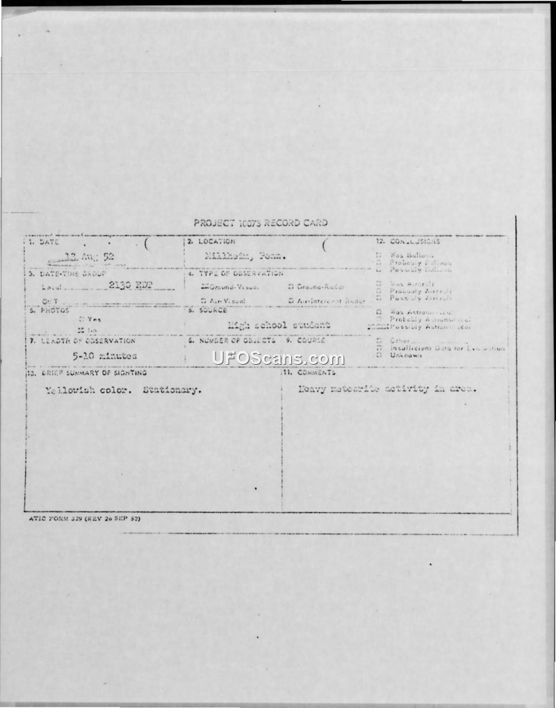 Project 10073 Record Card and Air Intelligence Information Report — Millheim, Pennsylvania, 13 August 1952