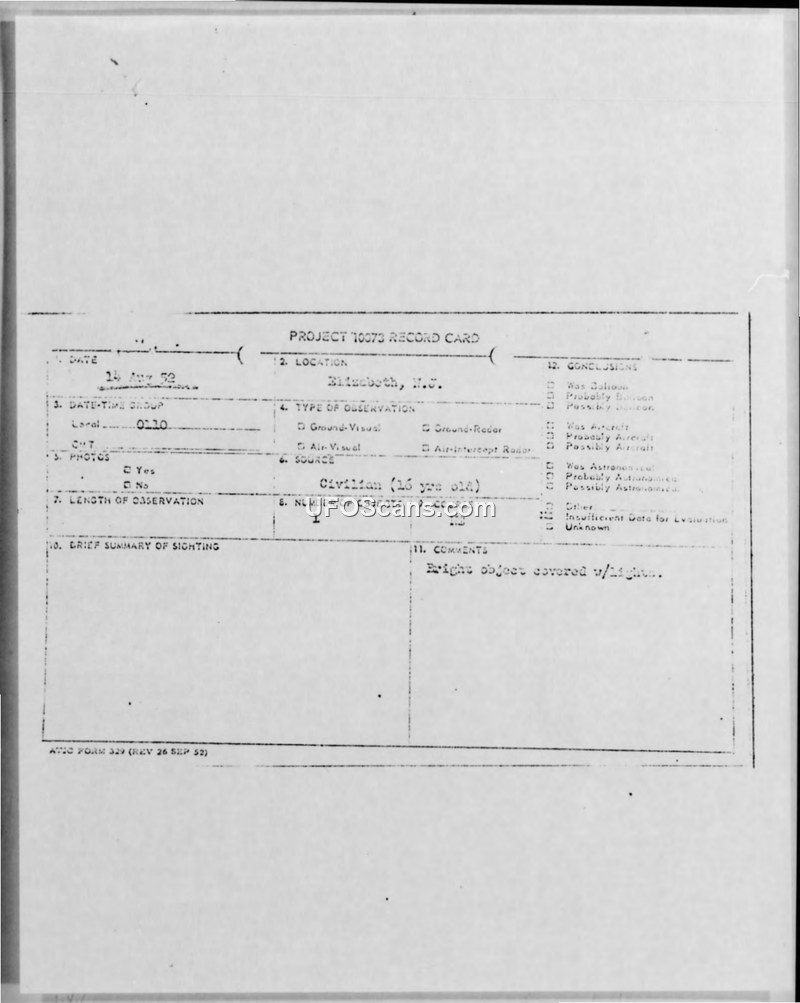 Project 10073 Record Card — Elizabeth, N.J., 14 August 1952