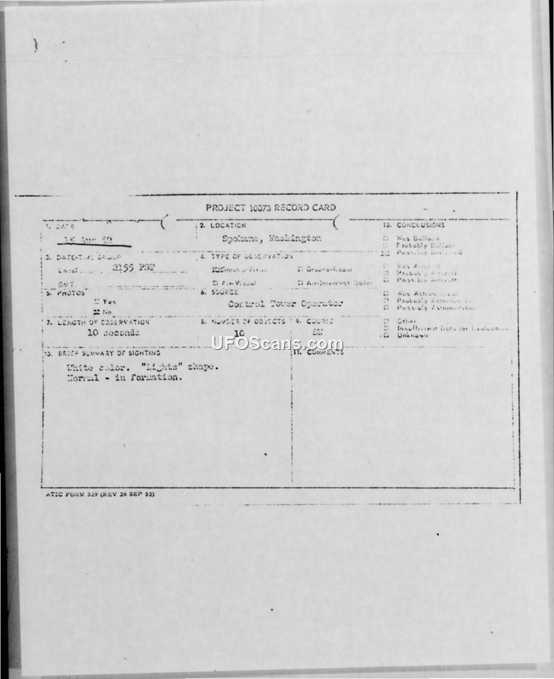 Project 10073 Record Card — Spokane, Washington, 15 August 1952
