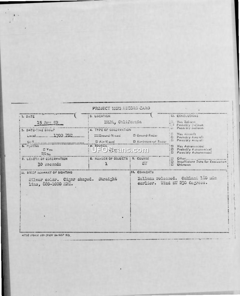 On August 15, 1952, at 1700 PDT, a witness named Diane Robinson observed an unidentified aerial object while stationed at a Ground Observer Corps (GOC) post in Napa, California. The witness reported seeing a single, silver-colored, cigar-shaped object, estimated to be the size of a large aircraft. The object was observed for approximately 30 seconds as it traveled in a straight line toward the southwest at an estimated speed of 800 to 1000 miles per hour at an altitude of 10,000 feet. The witness reported that no sound was emitted by the object. The sighting was reported to the 28th Air Division at Hamilton Air Force Base. Official documentation, including a Project 10073 record card and a teletype message, indicates that the investigation considered the possibility of a balloon. Weather data provided in the report noted that a balloon had been released from Oakland 180 minutes prior to the sighting, and wind conditions at 10,000 feet were recorded as 230 degrees at 9 knots. Based on this information, the final evaluation concluded that the object was 'probably a balloon.' The report includes various administrative forms, including a weather data sheet and a worksheet, confirming the details of the observation and the subsequent analysis by the Air Technical Intelligence Center.