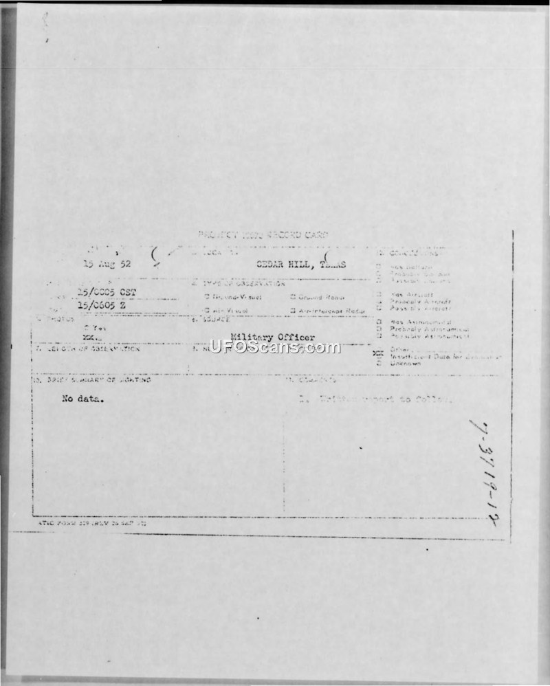 A military officer reported an unidentified aerial object near Cedar Hill, Texas, on August 15, 1952. The incident was documented under Project 10073, but officials concluded there was insufficient data for a formal evaluation.