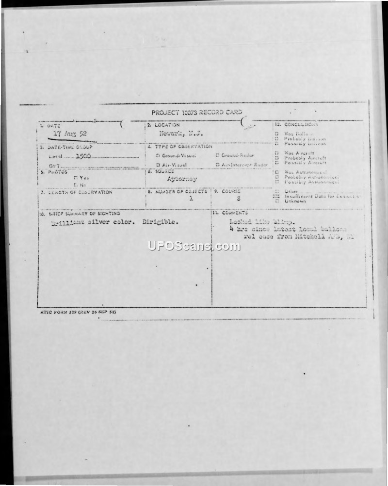 Project 10073 Record Card and Report — Newark, N.J., 17 August 1952