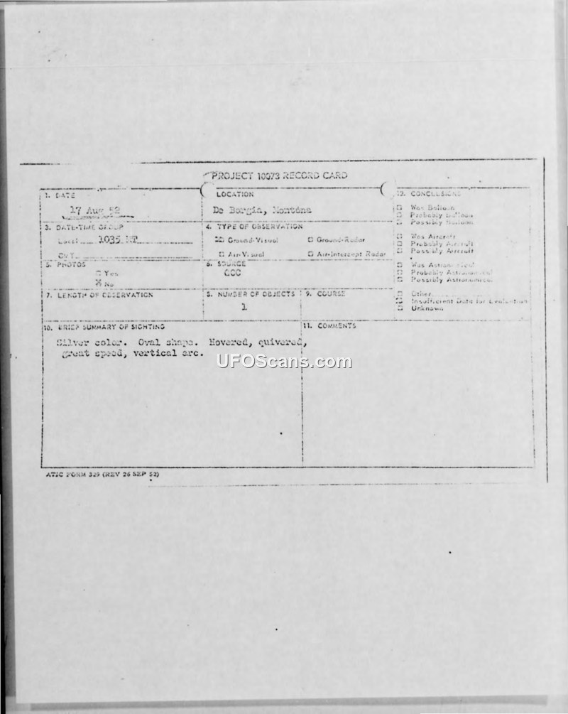 Project 10073 Record Card — De Borgia, Montana, 17 August 1952