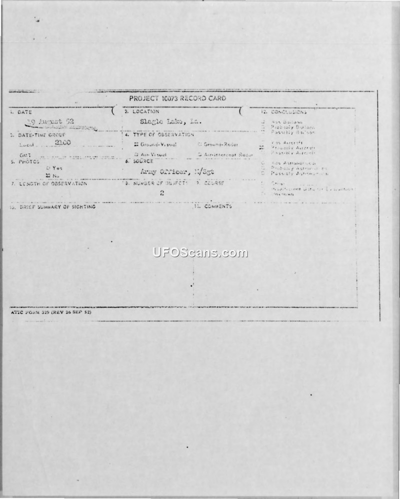 This document contains a collection of reports and correspondence regarding an unidentified aerial phenomenon sighting that occurred on the night of August 19, 1952, near Slagle Lake, Louisiana. The primary witnesses were a Lieutenant Colonel from the Louisiana Military District and a civilian employee from the Camp Polk Purchasing and Contracting office. The witnesses were seated on a pier at Slagle Lake when they observed two unidentified objects. The objects were initially described as white, round lights, approximately the size of a five-inch disk held at arm's length. Over a period of ten to fifteen minutes, the objects performed various maneuvers, including remaining stationary, changing color to pulsating red and green, and moving in different directions. One witness, who identified himself as a pilot, noted that the objects did not appear to be meteors or jet aircraft. He also reported hearing a sound resembling the 'put-put' of an outboard motor, although the other witness could not confirm this sound. The weather conditions were reported as clear, dark, and cloudless with no moon. The objects eventually disappeared, with one witness describing the disappearance as similar to an electric light being switched off. The report includes a Project 10073 record card, a cover letter from Headquarters Fourth Army to the Air Materiel Command, and detailed statements from the witnesses, including sketches of the objects' movements. The official recommendation was that the report be disseminated to the appropriate Air Force and Army intelligence agencies for further review in relation to other sightings reported during the same period.