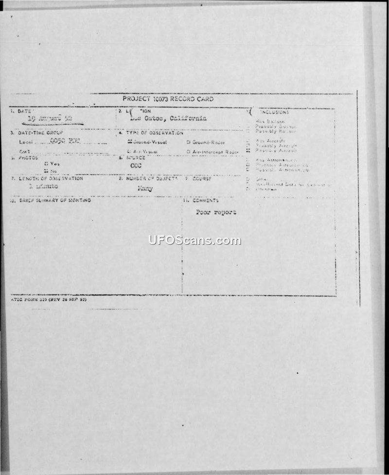 Project 10073 Record Card and Observer Questionnaire — Los Gatos, California, 19 August 1952