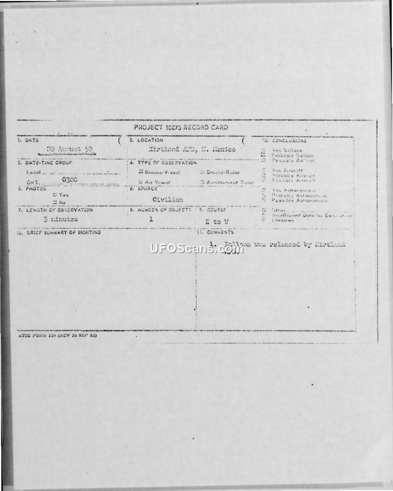 Weather balloon released at Kirtland AFB 20/0300Z Aug 52.