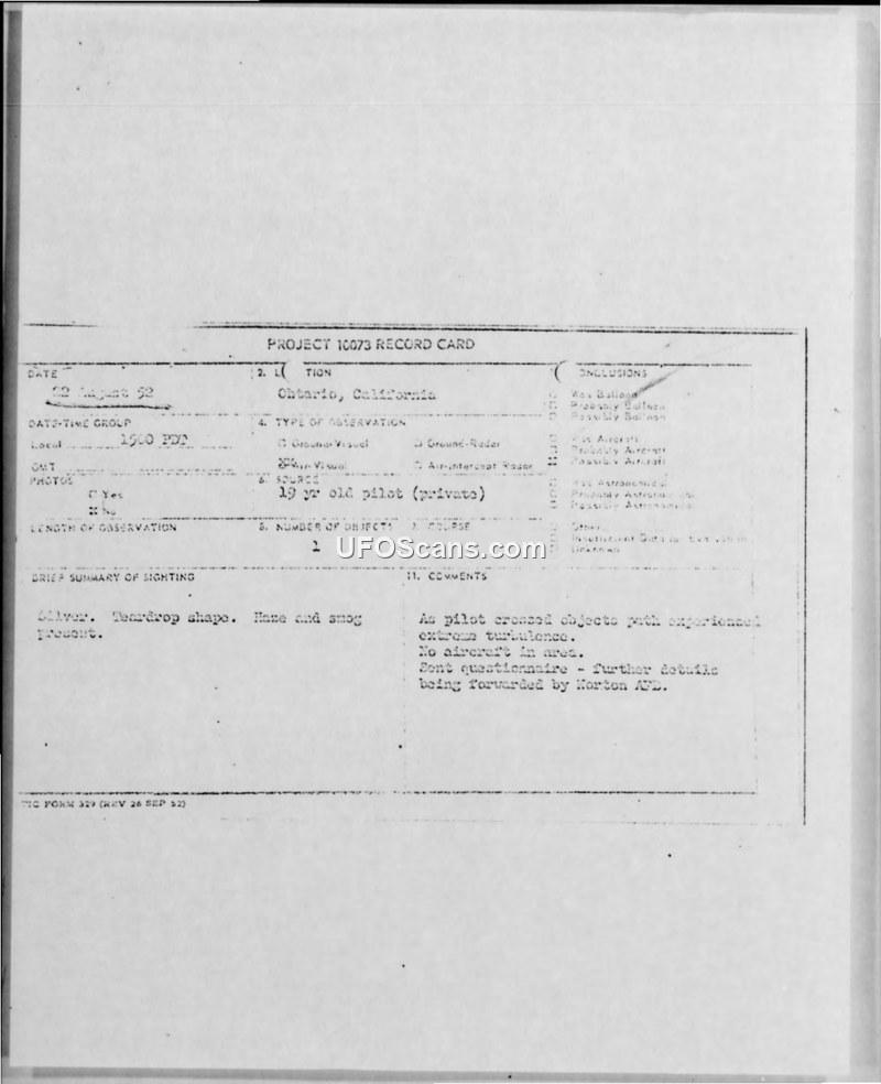 A 19-year-old private pilot reported encountering two silver, teardrop-shaped objects at 3,000 feet over California on 22 August 1952. The objects moved at supersonic speeds and caused severe turbulence, but military radar failed to detect them.