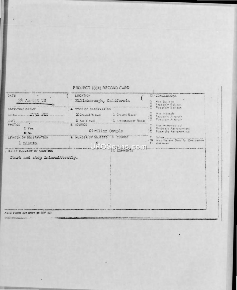 A civilian couple in Hillsborough, California, reported observing two silver-gray, cone-shaped objects moving at high speed on 24 August 1952. The report was filed under Project 10073 and forwarded to the Air Technical Intelligence Center.