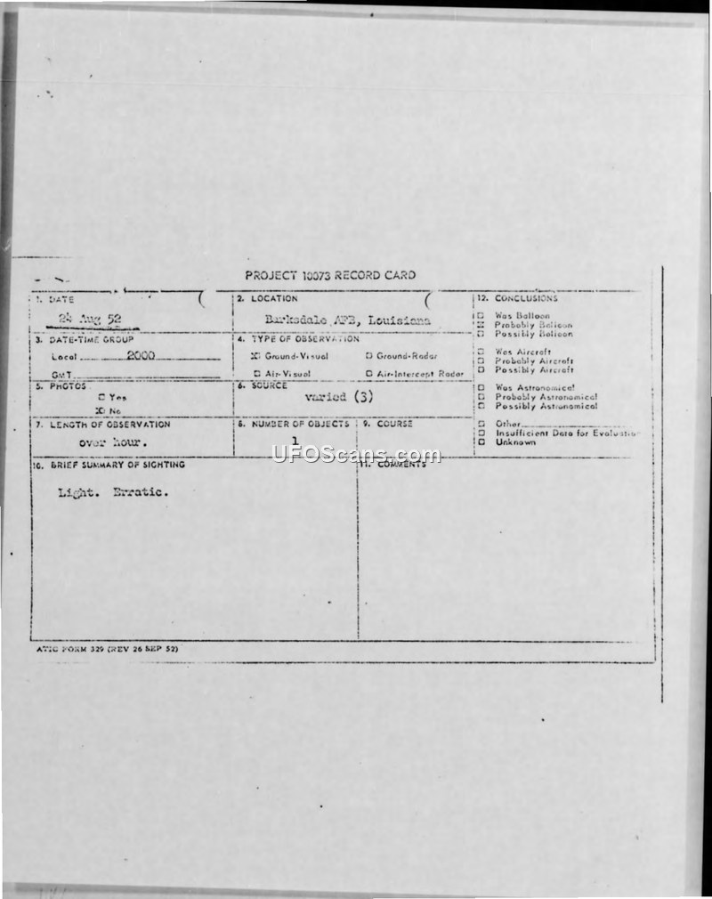 Three witnesses at Barksdale AFB observed an erratic, bright light for nearly an hour on August 24, 1952. Intelligence officials concluded the object was likely a weather balloon released from the base.