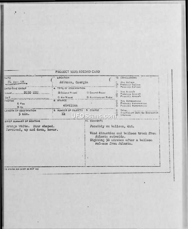 This document contains a series of Project 10073 record cards and military teletype communications regarding two separate unidentified aerial phenomena sightings in Atlanta, Georgia, in August 1952. The first incident occurred on August 24, 1952, at 2150 EST, where a witness described a star-shaped, orange-white object that revolved, moved up and down, and hovered for approximately five minutes. The witness, identified as a technical writer for Delta Air Lines, was noted as being familiar with aircraft. A second report, dated August 26, 1952, describes a similar sighting of an elliptical-shaped object with white lights, observed for 15 to 20 minutes from a residence in the northwest section of Atlanta. In both instances, the military investigators from the 35th Air Division at Dobbins AFB, Georgia, coordinated with the Air Technical Intelligence Center (ATIC) to evaluate the reports. The official conclusion for these sightings was that they were likely weather balloons released by the Civil Aeronautics Administration (CAA). The investigators noted that the wind direction and the tracked paths of the balloons released from Atlanta coincided with the timing and location of the reported sightings, specifically noting that one observation occurred 50 minutes after a balloon release. The reports emphasize the lack of sound or propulsion means observed by the witnesses and confirm that no known air traffic was in the area at the time of the sightings.