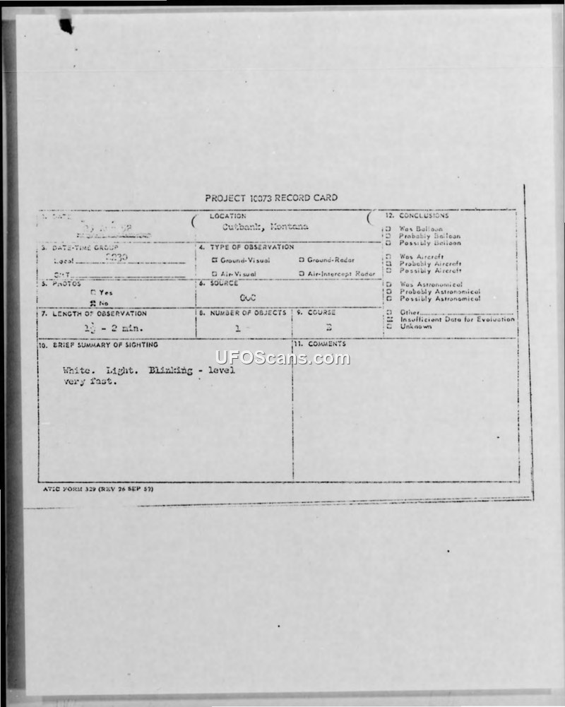 A GOC observer in Cutbank, Montana, reported a fast-moving, blinking white light on August 25, 1952. The object exhibited rapid, non-linear flight characteristics before disappearing.