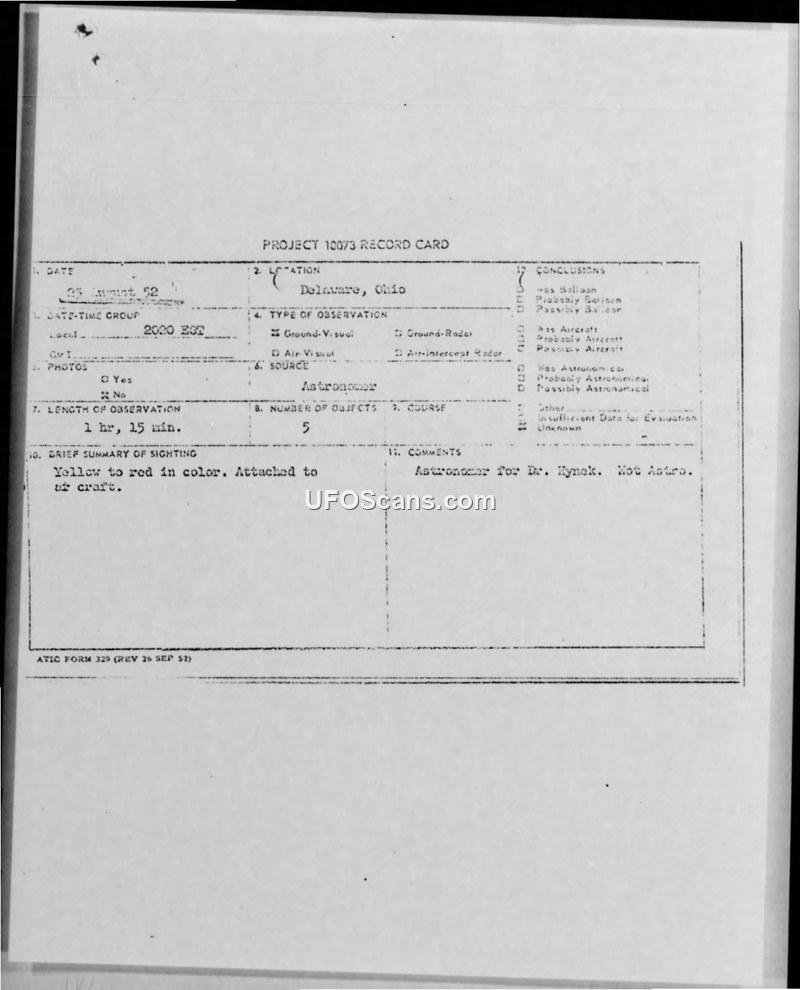 Project 10073 Record Card — Delaware, Ohio, August 25, 1952