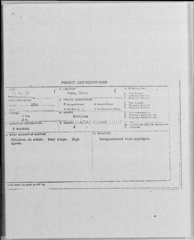 A report on a 1952 sighting of two aluminum, oval-shaped objects in Waco, Texas, by a bank executive and his son. The investigation found no meteorological explanation and no physical evidence.