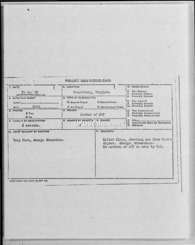 A Ground Observer Corps member in Petersburg, Virginia, reported two fast-moving objects with yellow flames trailing behind them on August 25, 1952. The incident was investigated under Project 10073, but no official explanation was reached.