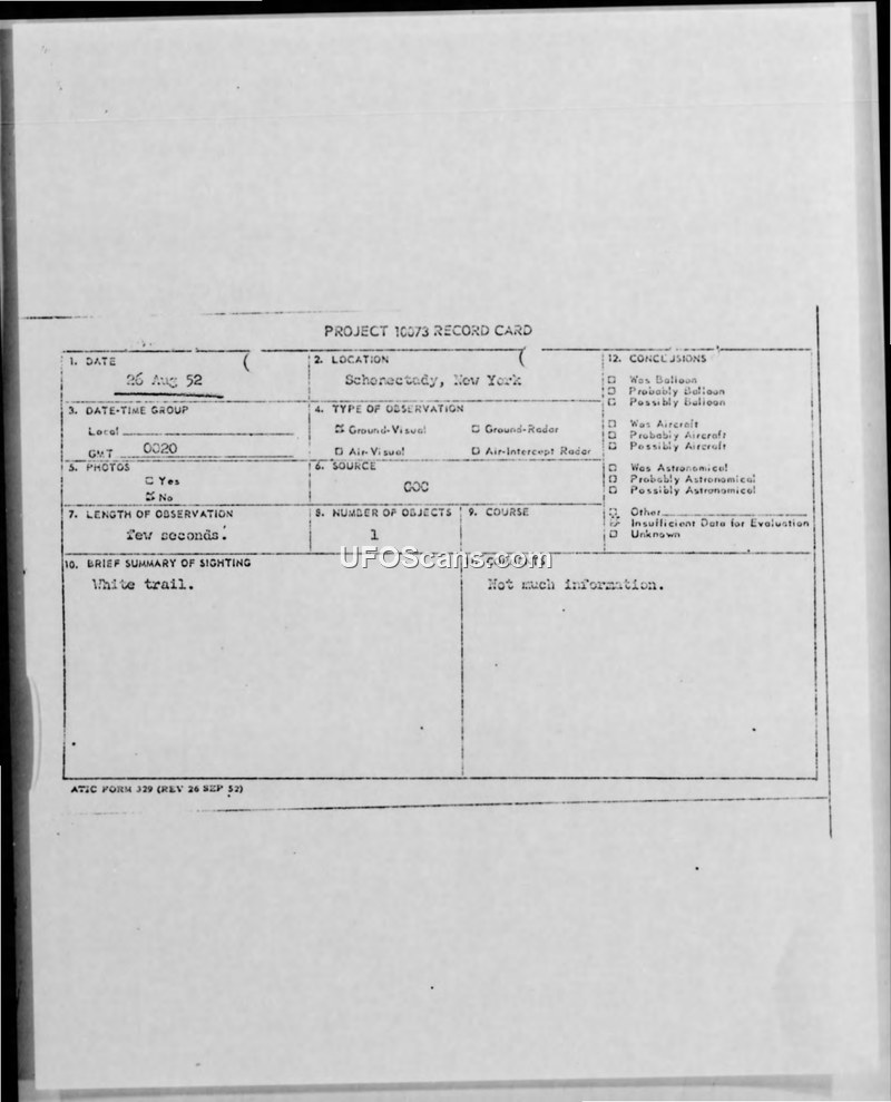 Project 10073 Record Card — Schenectady, New York, 26 August 1952