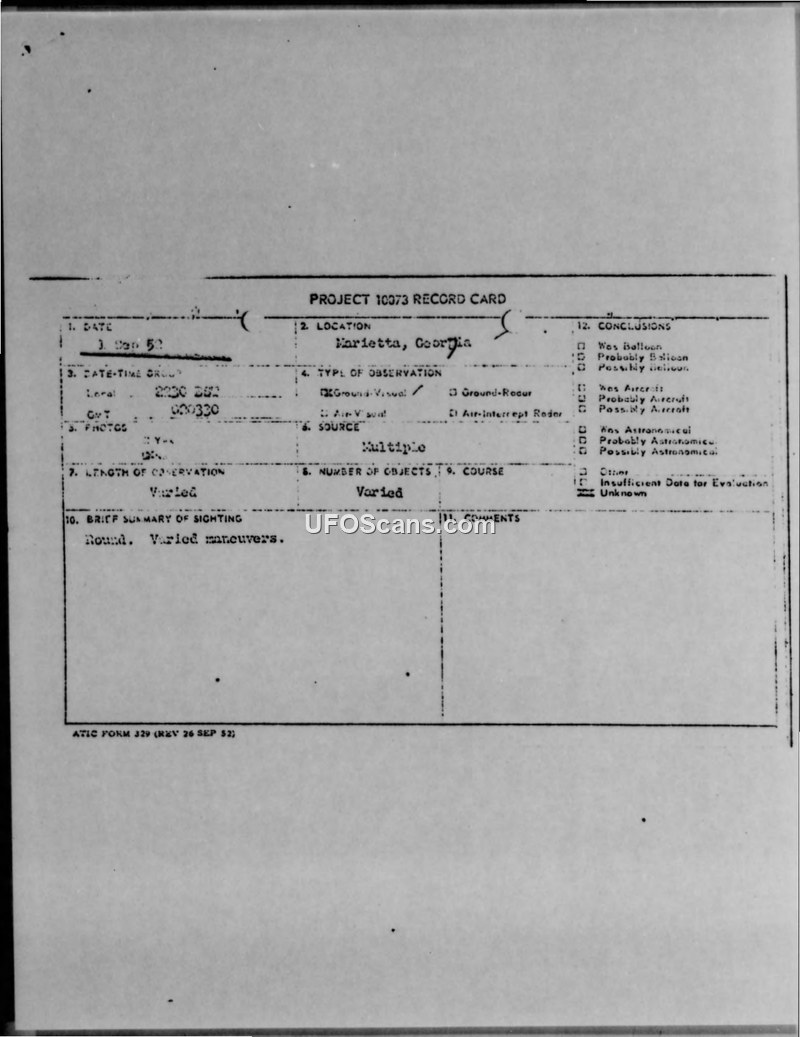 This document is a collection of reports and a Project 10073 record card concerning a series of sightings that occurred on September 1, 1952, in the vicinity of Marietta, Georgia. The reports, originating from the 35th Air Division at Dobbins Air Force Base, describe multiple sightings of unidentified aerial phenomena. Witnesses, including a former tail gunner with B-25 experience, reported objects that were described as round, disk-like, or spinning tops. The objects were observed to be very large, moving at high speeds—estimated in excess of 1000 MPH—and performing varied maneuvers, including dipping, spinning, and moving up, down, left, and right. Some witnesses noted the objects were white, red, or bluish-green, and that they emitted sparks or a greenish vapor trail. Approximately 25 people were reported to have seen the objects, with some observers using field glasses. Despite the high number of witnesses and the detailed descriptions of the objects' behavior, there was no physical evidence, no radar contact, and no air traffic in the area at the time of the sightings. The official evaluation on the record card and in the comments section reflects the difficulty in reaching a conclusion. The investigator noted that while some of the reports were likely attributable to weather balloons, the significant discrepancies between the various accounts made a definitive evaluation impossible, ultimately classifying the event as 'Unknown'. The documents include operational immediate cables sent to the Air Technical Intelligence Center at Wright-Patterson Air Force Base and the Director of Intelligence at HQ USAF, indicating the urgency with which these reports were handled by the military.