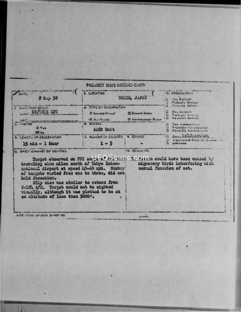 This document consists of a series of Air Intelligence Information Reports (IR-40-52 and IR-584-52) regarding a radar sighting incident that occurred on 2 September 1952 at Tokyo International Airport (Haneda AB), Japan. At 2015 LST, M/Sgt. Joseph H. Wehling, the NCOIC of the GCA team, observed between one and three unidentified targets on the GCA unit's PPI scope. The targets were located nine miles north of the airfield, traveling at speeds between 40 and 60 mph at an altitude of 3000 feet or less. The targets did not maintain formation and remained within the northeast quadrant of the field for approximately one hour. The radar return was described as being similar in size to that of a C-124 aircraft. Despite the radar contact, the targets were not sighted visually. The GCI unit at Shiroi AB also tracked the targets in the same area. The weather conditions at the time were reported as 10,000 feet broken clouds with 7 miles visibility. The official conclusion reached by the personnel involved was that the radar returns were caused by migratory birds. This conclusion was supported by the reporting officer, who noted that the Japanese Ministry of Agriculture and Forestry reports large numbers of migratory birds, such as snipe and plover, in the Tokyo area during the mid-August to October period. These birds can grow to a large size and fly in groups, which may account for the radar echoes. A reporting officer's comment suggested that, as a matter of pure speculation, migratory birds arriving from areas with radioactive material or clouds might produce a stronger-than-expected radar echo. The report was not forwarded by electrical means due to the low evaluation of the sighting and delays in receipt. The incident was noted to be in approximately the same position as a previous contact reported on 5 August 1952.