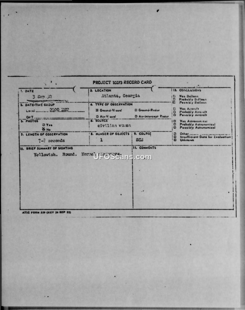 Project 10073 Record Card and Operational Immediate Reports — Atlanta, Georgia, 3 September 1952