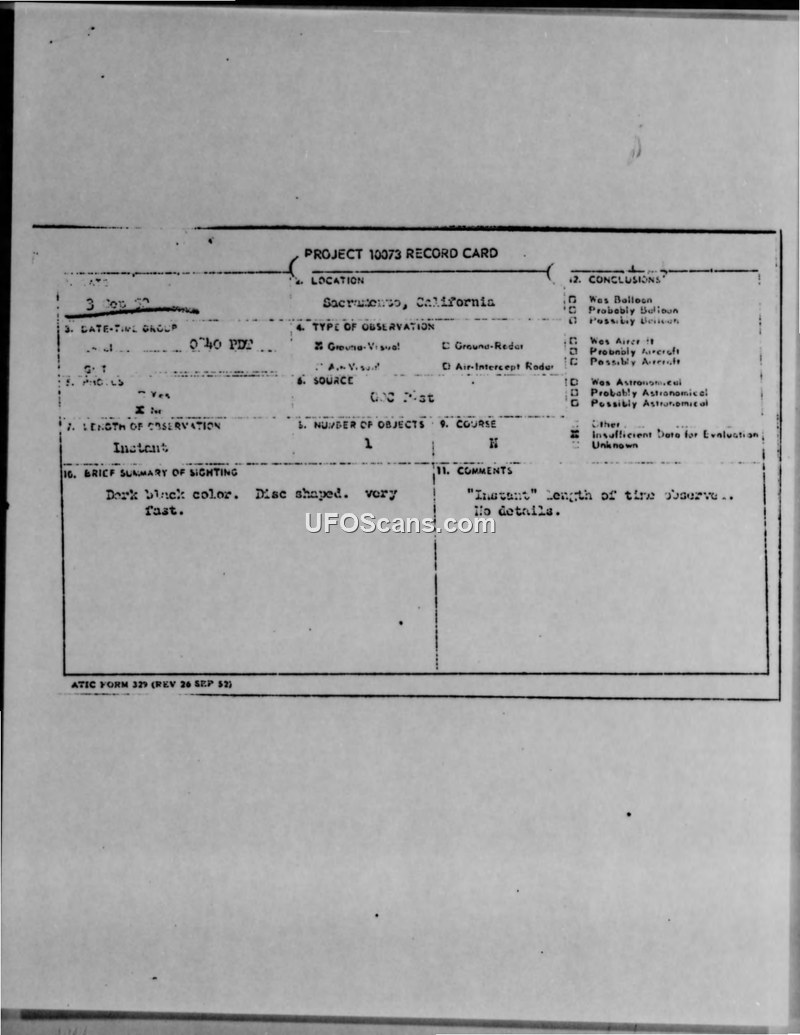 This document comprises a Project 10073 record card and a detailed observer questionnaire regarding a UAP sighting on September 3, 1952, in Sacramento, California. The witness, Irene Carlson, reported observing a single, disc-shaped object from the California-Western Building. The object was described as initially dark black in color, later appearing as shimmering silver, and was noted to be moving very fast in a northerly direction at an estimated altitude of 5,000 to 10,000 feet. The witness, who was on duty at a Ground Observer Corps (GOC) post, reported the sighting for approximately five minutes. A significant detail provided in the observer's additional comments is that a bi-motor airplane crossed the path of the object at the same altitude, moving in the opposite direction. As the plane passed, its starboard motor emitted dark smoke. The incident was reported to the Sacramento Filter Center. The official record card indicates the sighting was for an instant, though the questionnaire clarifies the duration was five minutes. The report includes sketches of the object's path and shape, as well as its appearance relative to the horizon. The case was processed by the Air Technical Intelligence Center (ATIC) under the project designation 10073.