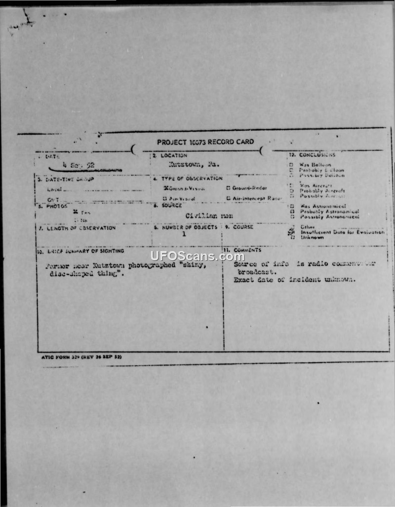 A Project 10073 record card documents a farmer's sighting and photography of a shiny, disc-shaped object near Kutztown, Pennsylvania. The report, based on a Frank Edwards radio broadcast, was classified as having insufficient data for evaluation.