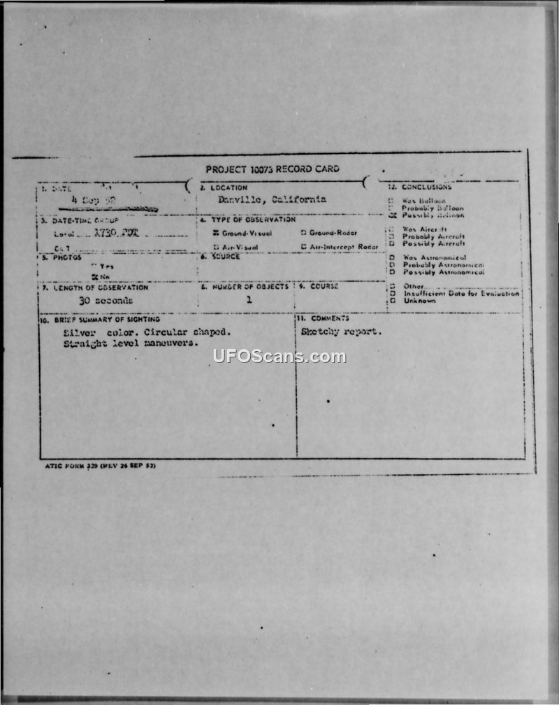 A 15-year-old student in Danville, California, reported a 30-second sighting of a silver, circular object on 4 September 1952. The report was processed by the Air Technical Intelligence Center under Project 10073, with administrative routing involving Los Alamos security personnel.