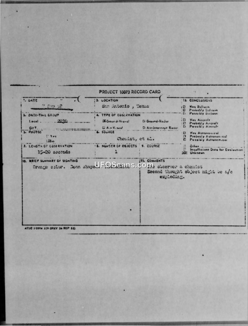 Project 10073 Record Card — San Antonio, Texas, 7 September 1952