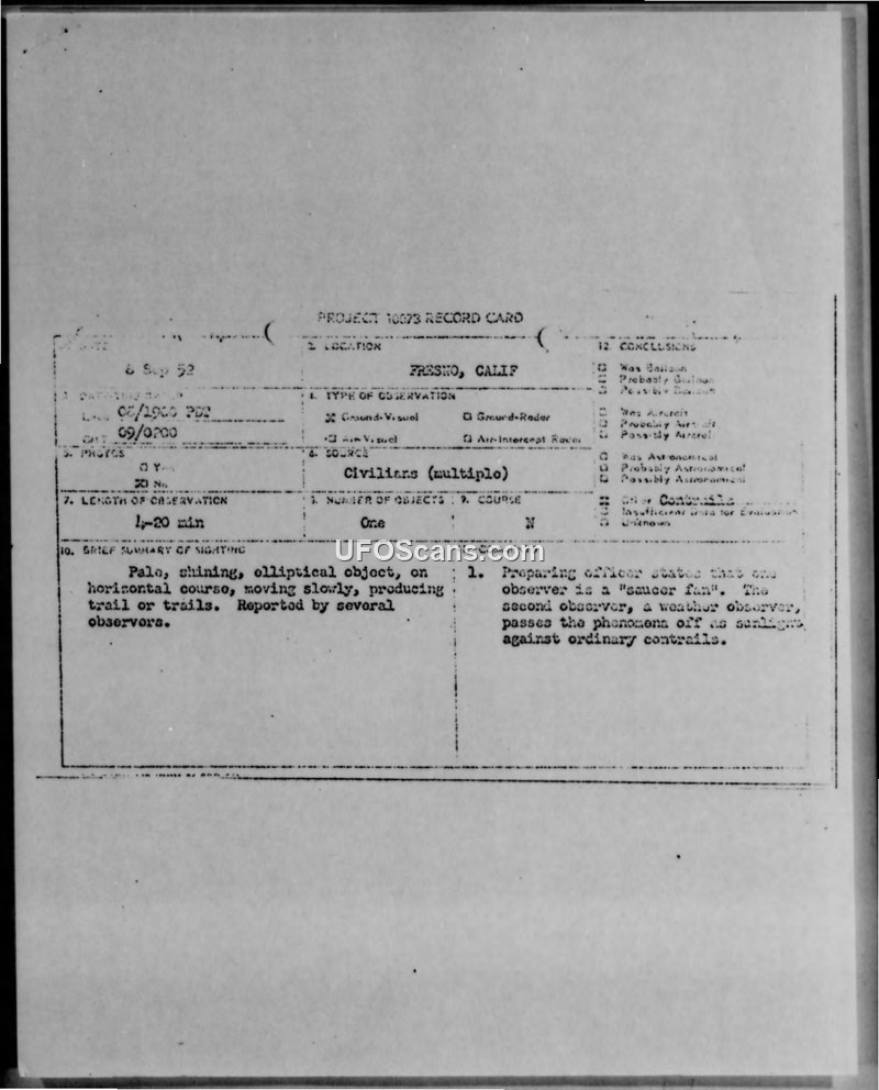 This report documents a 1952 UFO sighting in Fresno, California, which was officially attributed to jet aircraft condensation trails. It includes witness testimony, investigator notes, and correspondence regarding the investigation.