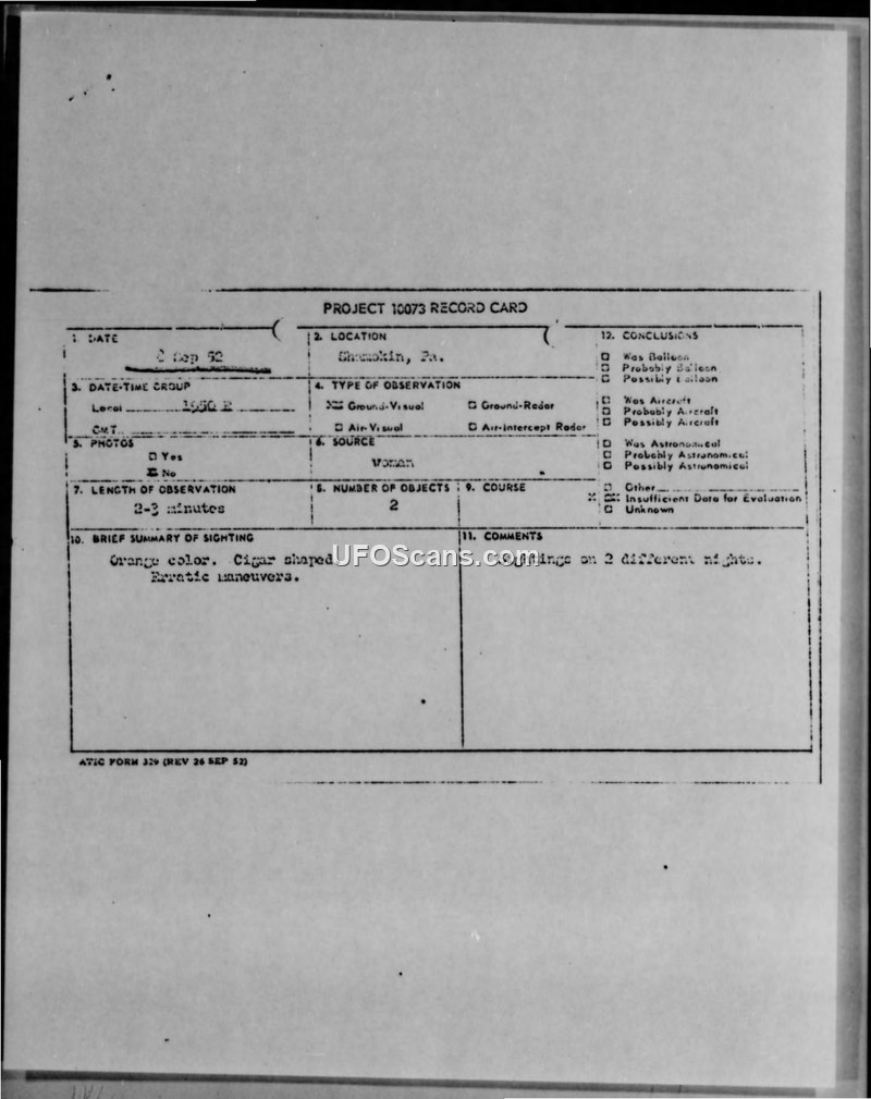 This document is a compilation of records, correspondence, and reports related to the Air Technical Intelligence Center's investigation of unidentified aerial phenomena, primarily under the umbrella of Project 10073 and Project Blue Book. The collection includes a record card for a sighting in Shamokin, Pennsylvania, on September 2, 1952, where a witness observed two cigar-shaped, orange objects performing erratic maneuvers for two to three minutes. The document also features a newspaper clipping from the New York Daily News dated September 14, 1952, detailing a sensational incident in Sutton, West Virginia, where a group of seven people, including Kathleen May, reported encountering a 10-foot tall entity with a green body and blood-red face.