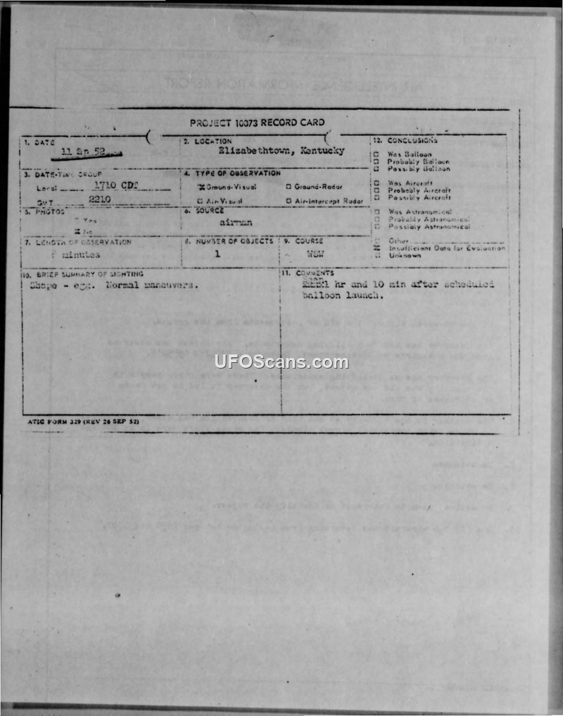 This document contains a collection of Project 10073 record cards, observer questionnaires, and an Air Intelligence Information Report regarding two separate sightings of unidentified aerial phenomena in 1952. The first incident occurred on January 11, 1952, near Elizabethtown, Kentucky. The witness, an insurance adjuster, reported seeing a single, egg-shaped object that appeared to be moving in a straight line from ENE to SSW at an estimated altitude of 4,000 to 6,000 feet and a speed of 175 to 200 miles per hour. The object was described as having a brilliant glow and no sound was heard. The report notes that the sighting occurred approximately one hour and ten minutes after a scheduled balloon launch. The second incident involves a report from a Department of the Army employee in District Heights, Maryland, on September 12, 1952. This observer described the object as an oval, roman candle-like shape that was descending at the speed and angle of a passenger plane. The witness noted the object had a bright blue and green color and disappeared below the horizon in the west. The document includes correspondence from the Air Technical Intelligence Center at Wright-Patterson Air Force Base, dated September 15, 1952, acknowledging receipt of the reports and providing questionnaires for the witnesses to complete. The intelligence report for the Kentucky sighting concludes that there was no evidence of an intercept or identification, and notes that a T-6 aircraft was in the vicinity during the time of the observation. The files reflect the standard procedure for collecting and documenting civilian reports of UAP during the early 1950s.