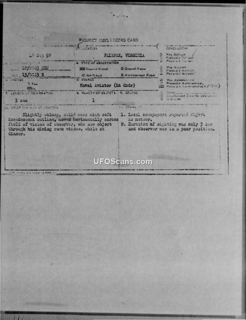 A Naval Aviator reported a 3-second sighting of a solid, oblong, greenish-white object in Fairfax, Virginia, on September 22, 1952. The official Air Force evaluation concluded there was insufficient data to identify the object.