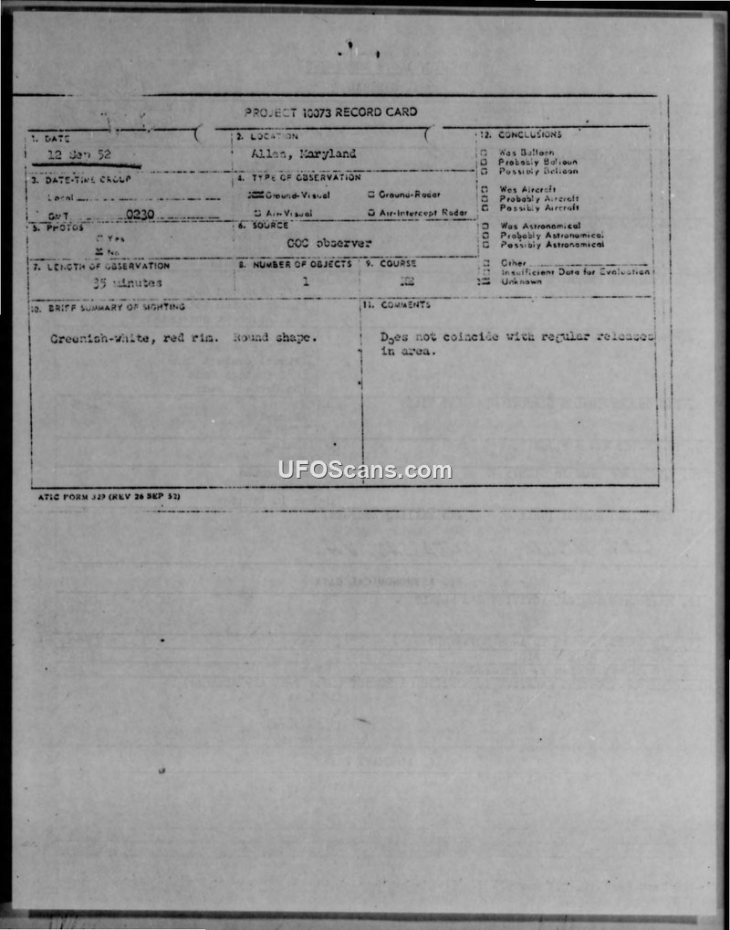 A Ground Observer Corps volunteer reported a round, greenish-white object with a red rim over Allen, Maryland, on 12 September 1952. Military radar checks detected no targets, and the official conclusion was insufficient data for evaluation.
