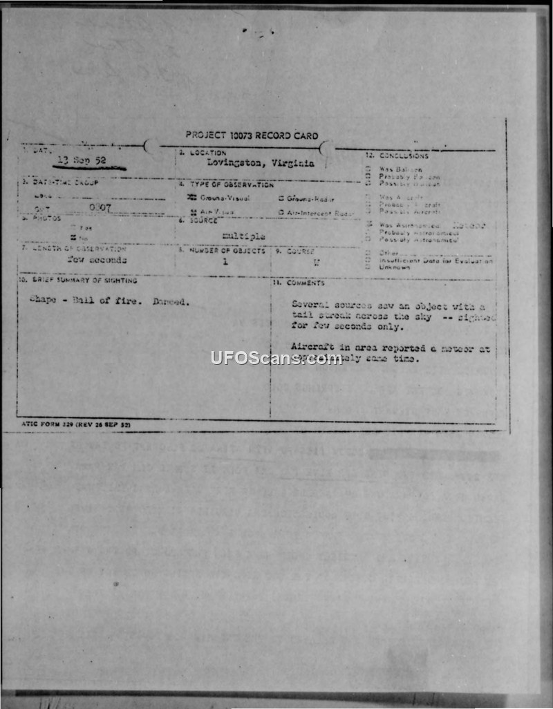 A blue ball of fire with a tail was sighted over Lovingston, Virginia, on September 13, 1952. The incident was investigated by the 771st AC and W Squadron and officially concluded to be a meteor.