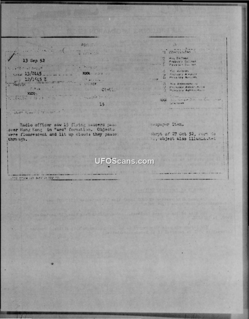 This document contains a series of Air Intelligence Information Reports and Project 10073 record cards documenting sightings of unidentified aerial phenomena in the Far East during September 1952. The first report, dated 22 September 1952, details a sighting in Hong Kong on 13 September 1952. A radio officer, whose hobby is electronics, reported observing 15 flying saucers passing over Hong Kong in an 'arc' formation at 0145 hours. The objects were described as fluorescent, three times the size of a star, and capable of illuminating the clouds they passed through. The weather at the time was reported as overcast with continuous light rain. The reporting officer, Major Frederick W. Gerhard, Jr., noted that the witness was unknown to the office and that this was the first such report in Hong Kong. A second report, dated 6 October 1952, concerns a sighting in Kuching, Sarawak, on 19 September 1952. Members of an open-air concert audience reported a brightly illuminated greenish-white object traveling from north to south at high altitude and great speed. The object was visible for approximately 10 seconds and was accompanied by a 'screeching sound' that lasted three seconds. Captain Kirkwood G. Miers, the reporting officer, noted that this was the second such occurrence in the Malaya-Borneo area. He further remarked that previous reports had been discredited by the R.A.F. as jet contrails and suggested that the current sighting was likely an optical illusion, with the sound being a mere coincidence. Additionally, a Project 10073 record card is included for a sighting at Gander Lake, Newfoundland, on 23 September 1952, where an operations officer at Pepperrell AFB observed a bright light moving slowly and soundlessly toward Gander Airport. The documents collectively reflect the military's efforts to collect and categorize civilian reports of aerial phenomena during this period, often relying on newspaper accounts and initial witness statements while maintaining a skeptical stance regarding the nature of the objects.
