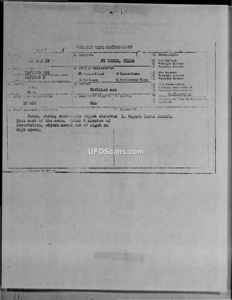 A civilian in Fort Worth reported a stationary, cigar-shaped object near the moon on September 13, 1952. Military investigation found no corresponding aircraft activity and concluded the report lacked sufficient detail.