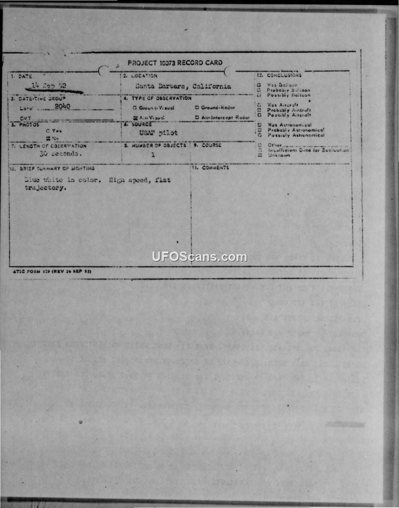 Project 10073 Record Card — Santa Barbara, California, 14 September 1952