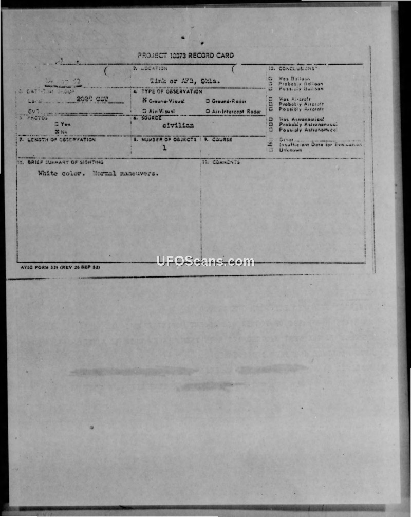 Project 10073 Record Card — Tinker AFB, Oklahoma, 14 Sep 52