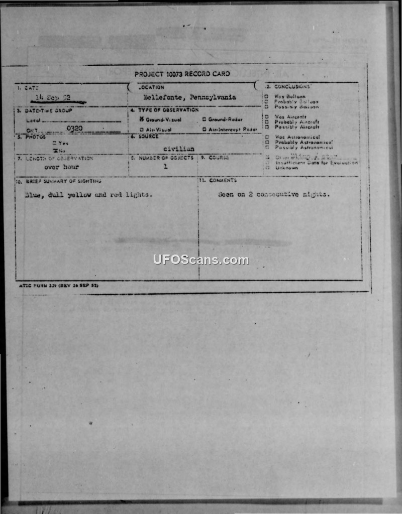 Project 10073 Record Card and Air Intelligence Information Report — Bellefonte, Pennsylvania, September 1952