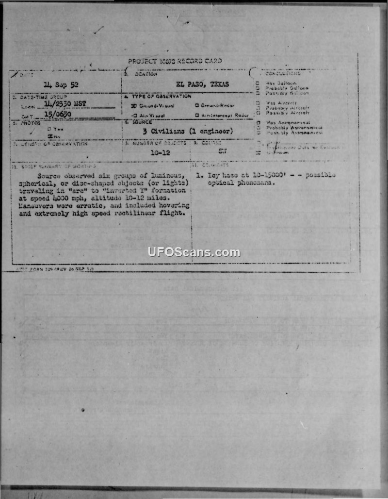 Project 10073 Record Card and Air Intelligence Information Report — El Paso, Texas, September 1952
