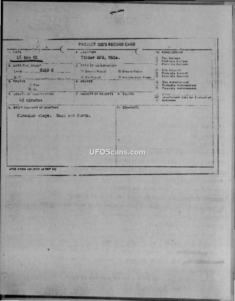 Project 10073 Record Card — Tinker AFB, Oklahoma, 16 September 1952