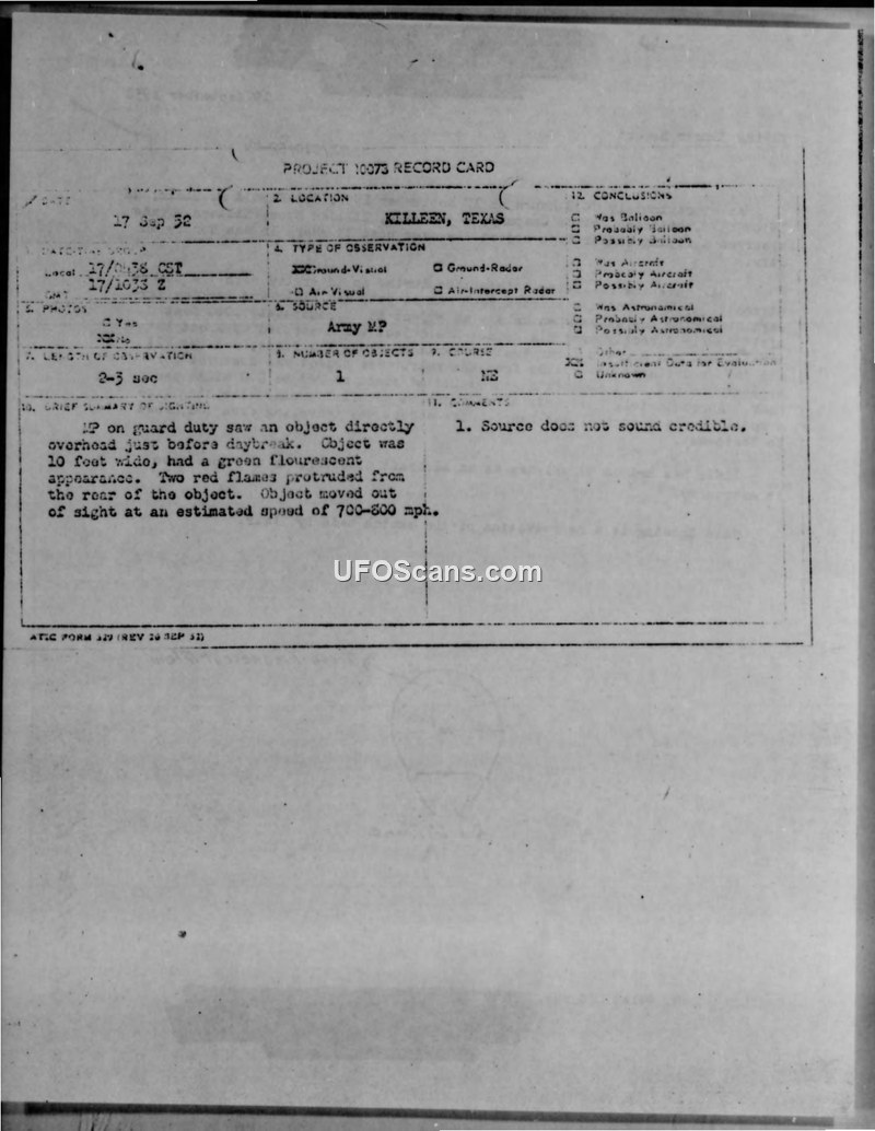 Corporal Harold M. Blair reported a 10-foot green fluorescent 'flying saucer' with red flames over Killeen Base, Texas, on 17 September 1952. Military investigators officially noted that the source did not sound credible.