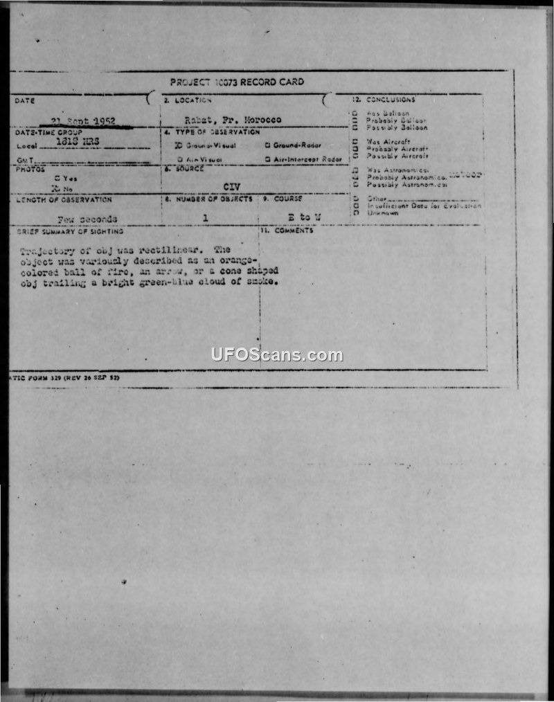 This report documents multiple sightings of an aerial object over Morocco on 21 September 1952. Intelligence analysts concluded the object was likely a meteor due to its rectilinear flight path and incandescent nature.