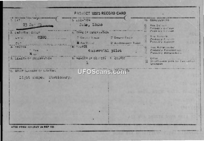 Project 10073 Record Card and Incident Report — Boise, Idaho, 23 September 1952