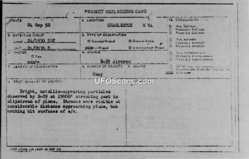 A B-29 aircrew reported observing numerous metallic-appearing particles streaming past their aircraft over West Virginia in 1952. The Air Weather Service could not explain the phenomenon, and the report was forwarded to Project Bluebook.
