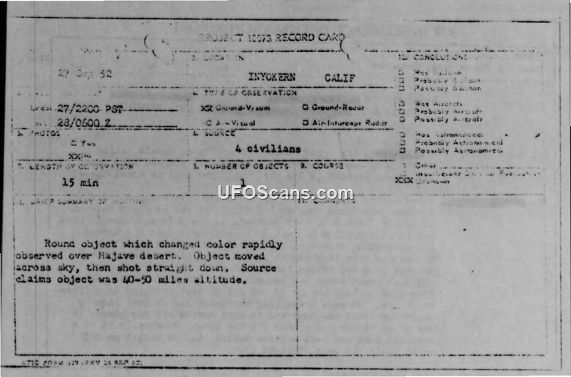 Report of Mysterious Object Seen in the Sky — Inyokern, California, 27 September 1952