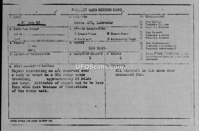 Project 10073 Record Card and Air Intelligence Information Report — Goose AB, Labrador, 20 September 1952