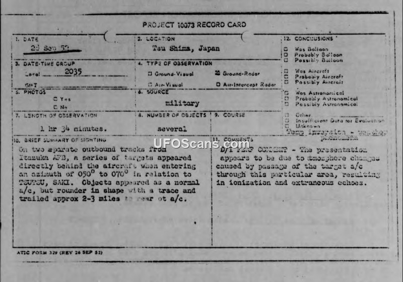 Radar operators in Japan reported unusual targets trailing aircraft on their scopes in September 1952. Intelligence officials concluded these were atmospheric phenomena caused by the aircraft themselves.